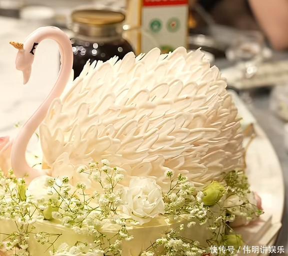 没过多大一会儿,张暖雅老公订的白天鹅蛋糕也送来了。这蛋糕吧,虽说不一定是当天酒店里最贵的,但说实话,普通老百姓家哪舍得买这么贵的生日蛋糕啊,看着就挺“奢侈”的。另外,蛋糕旁边还摆着一瓶茅台酒,这么一看,张暖雅老说自己老公是“农村小伙”,估计也就是嘴上说说,想博点大家的眼球罢了,真要纯农村的,哪能这么大方。
